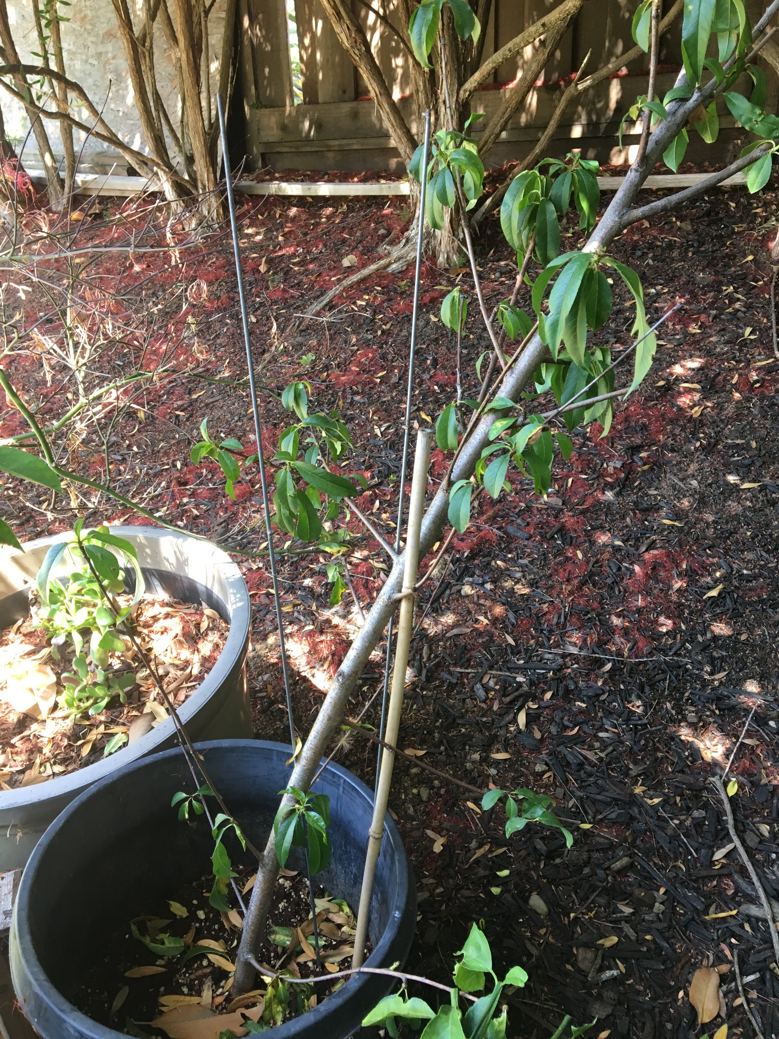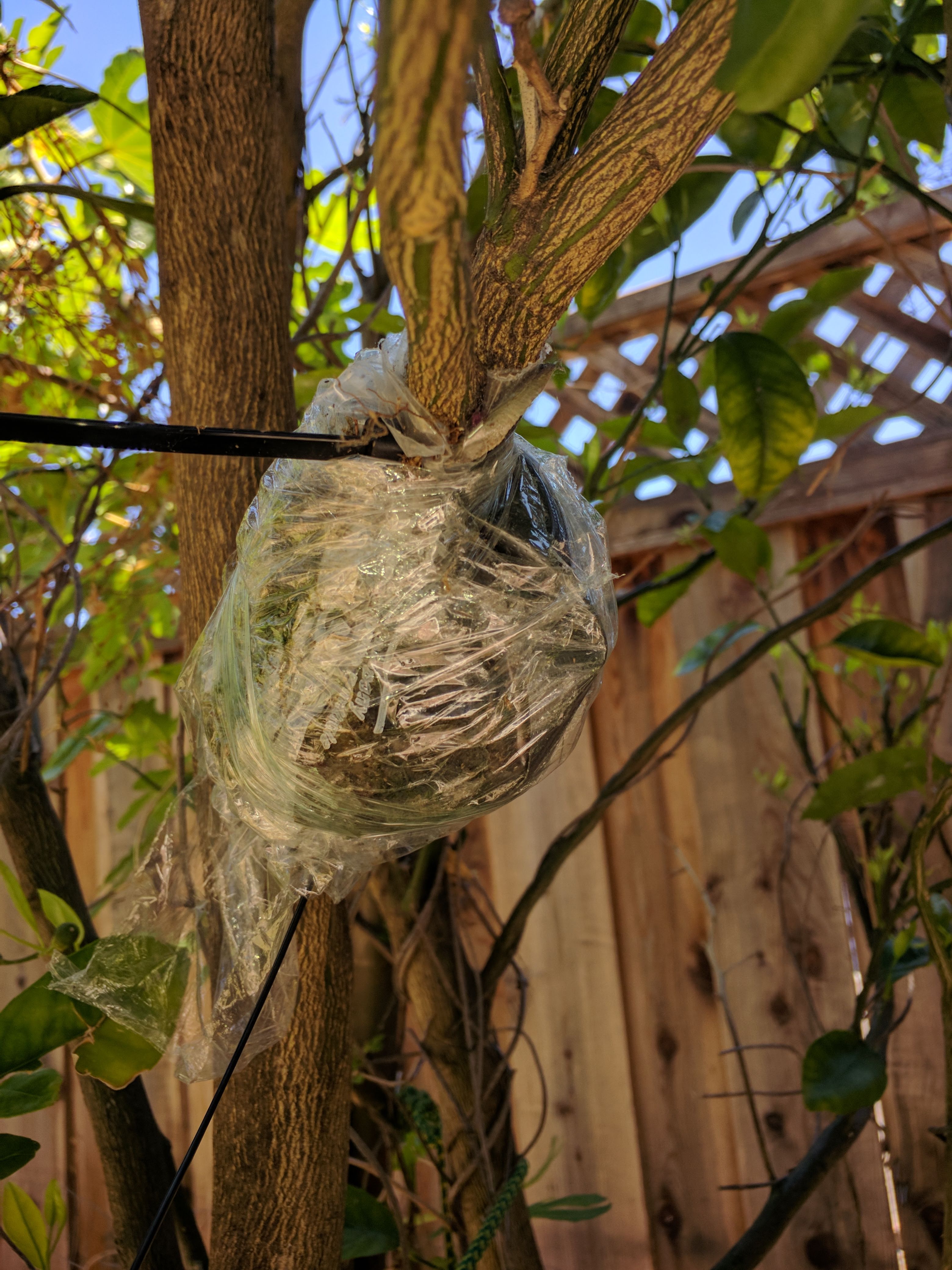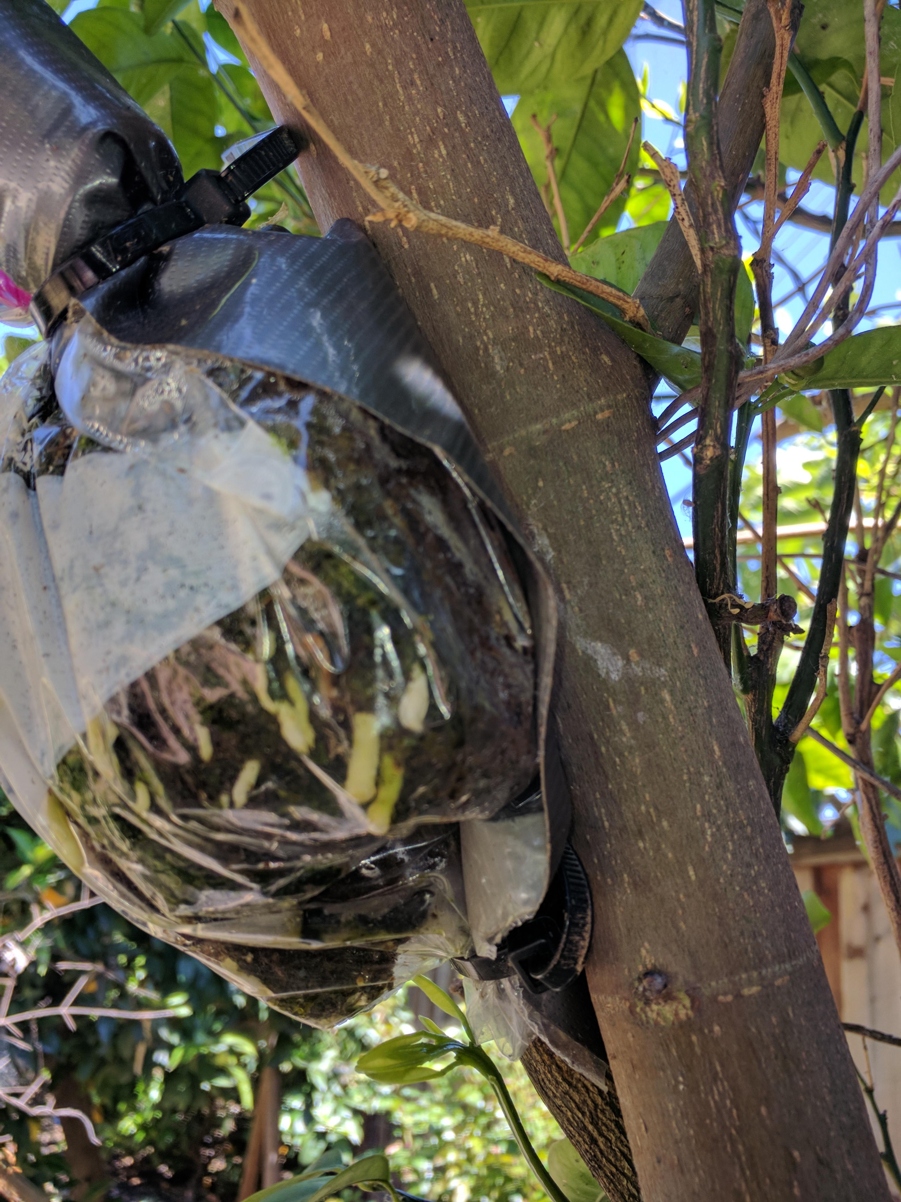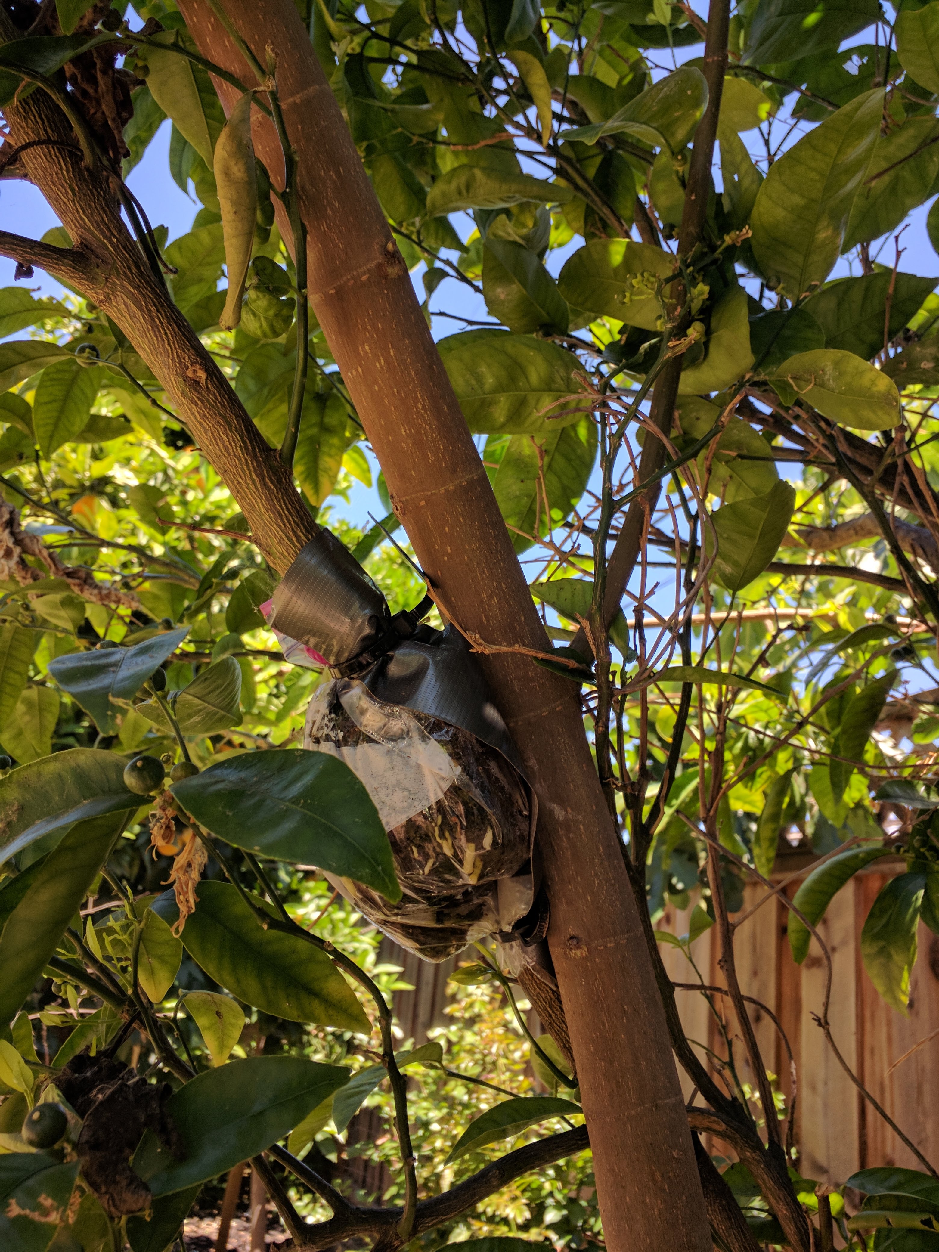 Out of desperation, I decided to try both approach grafting and air layering on the nectarine to double my success. Approach grafting is supposed to be one of the methods that is pretty much bullet proof. The first approach grafting attempt was initially successful I must say, but when I cut off the limbs from the host tree, the graft was not fully bonded, and hence snapped off the recipient tree. It was a bit of over confidence and a novice mistake on my part. So, I did another attempt in mid-May, and I am yet to see the results, as each time I need to wait for 4-6 weeks. I am hoping to have access to the home since its sold already, and the home owners are really nice people.