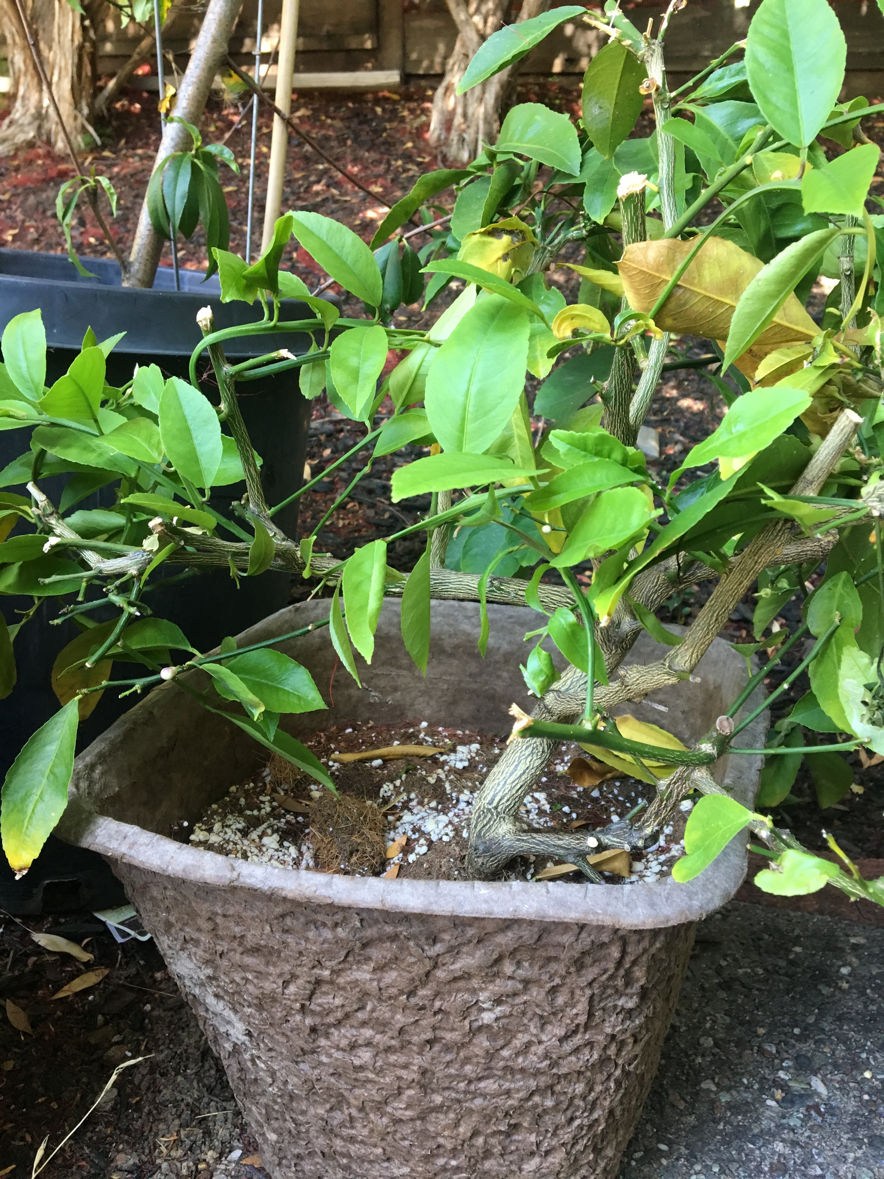 We took the same approach for the orange, lemons, mandarin, pomegranate, avocado and figs. The pomegranate did not make it, although this is one of the easier ones to root. Gophers had eaten up the roots of the small tree, and I guess it did not have additional energy to set out roots. I decided not to bring in the figs as I already had several varieties in my yard, and had no space for more of the same varieties at the moment. Moreover, they are very easy to propagate in just plain water. The avocado did not make it on time. There were small signs of roots, however nothing significant yet, and it was already week 6 by then. The next day we were closing on the home, and would not have regular access to monitor the progress. So, we decided to let go on this one too. However, much to our delight, the orange, lemon and mandarin were extremely successful and they all thrived. Beautiful white healthy roots were weeding through sphagnum moss, and neatly showing through the plastic wrap! Some things in life are just simply delightful experiences, especially the simple ones offered by nature. My husband and I were literally jumping with joy! The kids were truly delighted and amazed at the process. Whaaaat…..roots in a stem!! After a bit of a happy dance, we gently cut off the stem from the main tree and carefully loaded into our van. We brought them home and immediately potted them up in an easy to root medium.